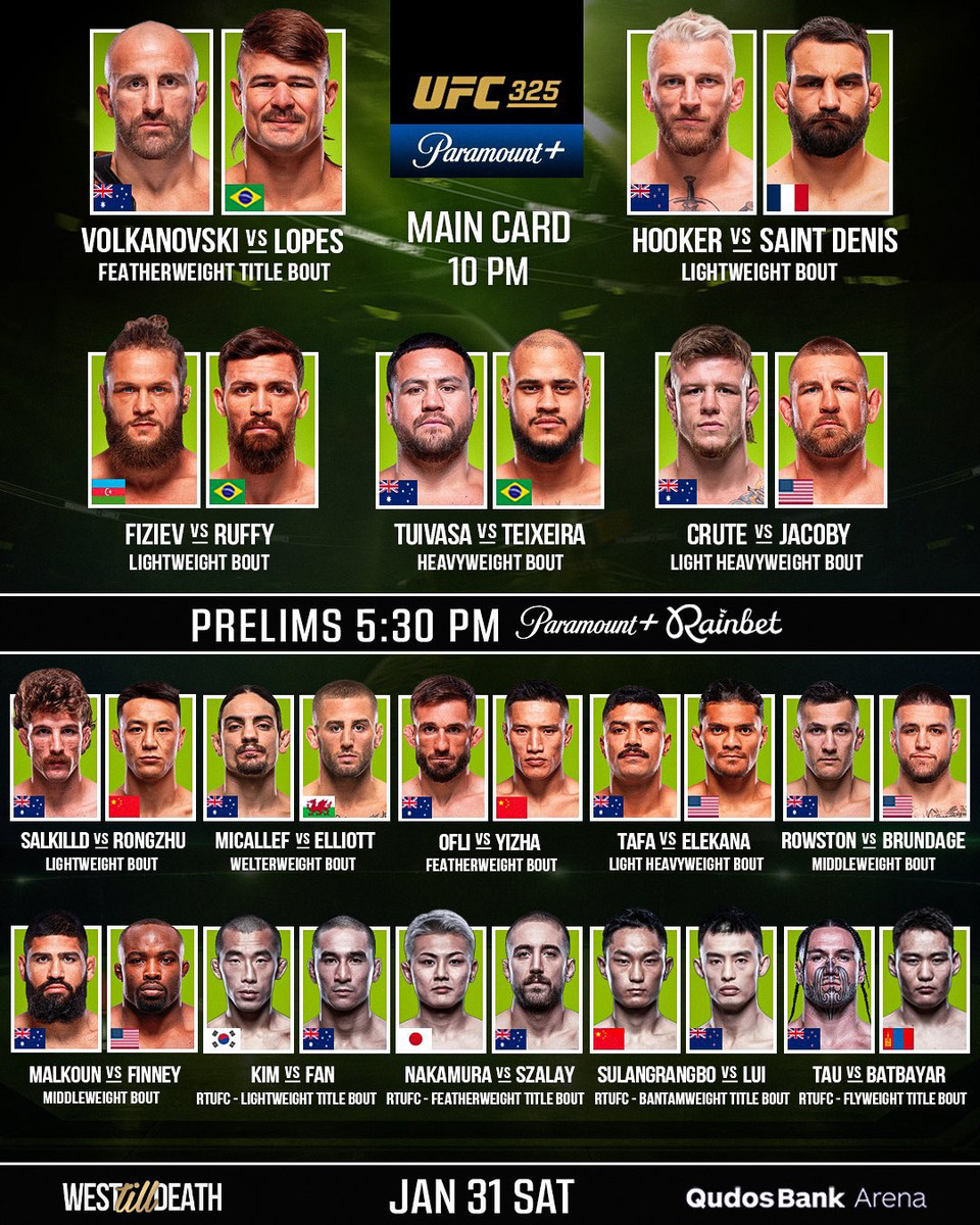 Турнір UFC 325 пройде у неділю вночі, 1 лютого. Стартує івент о 01:00 за Києвом з ранніх прелімів. О 03:00 почнуться бої попереднього карду, о 05:00 відбудуться головні поєдинки. Приблизний старт мейн-івенту Волкановські vs Лопес – 07:00.