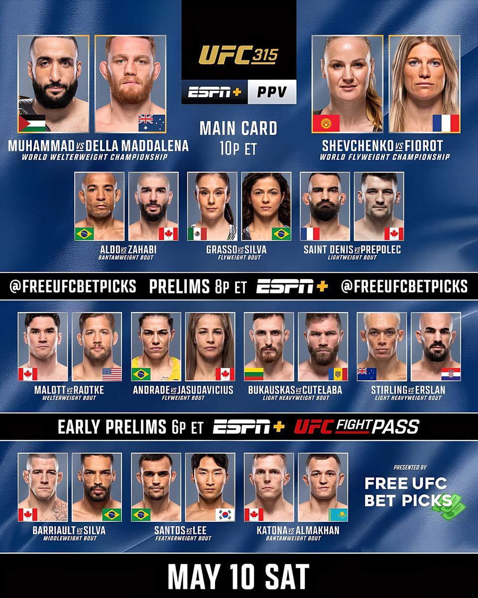 Турнір UFC 315 пройде у неділю вночі, 11 травня. Стартує івент о 01:00 за Києвом з ранніх прелімів. О 03:00 почнуться бої попереднього карду, о 05:00 відбудуться головні поєдинки. Приблизний старт мейн-івенту Мохаммад vs Маддалена – 07:00.