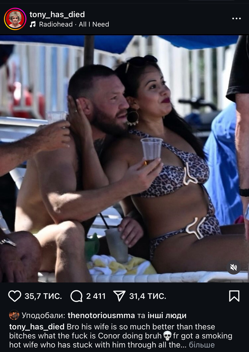 Що ще більше здивувало фанатів – Конор вподобав пост в Instagram, де його жорстко розкритикували за зраду нареченій Ді Девлін, з якою він разом уже понад 16 років і має чотирьох дітей. Автор поста не добирав слів, дорікаючи бійцеві за те, що той "зневажив жінку, яка пройшла з ним через усі звинувачення та скандали".