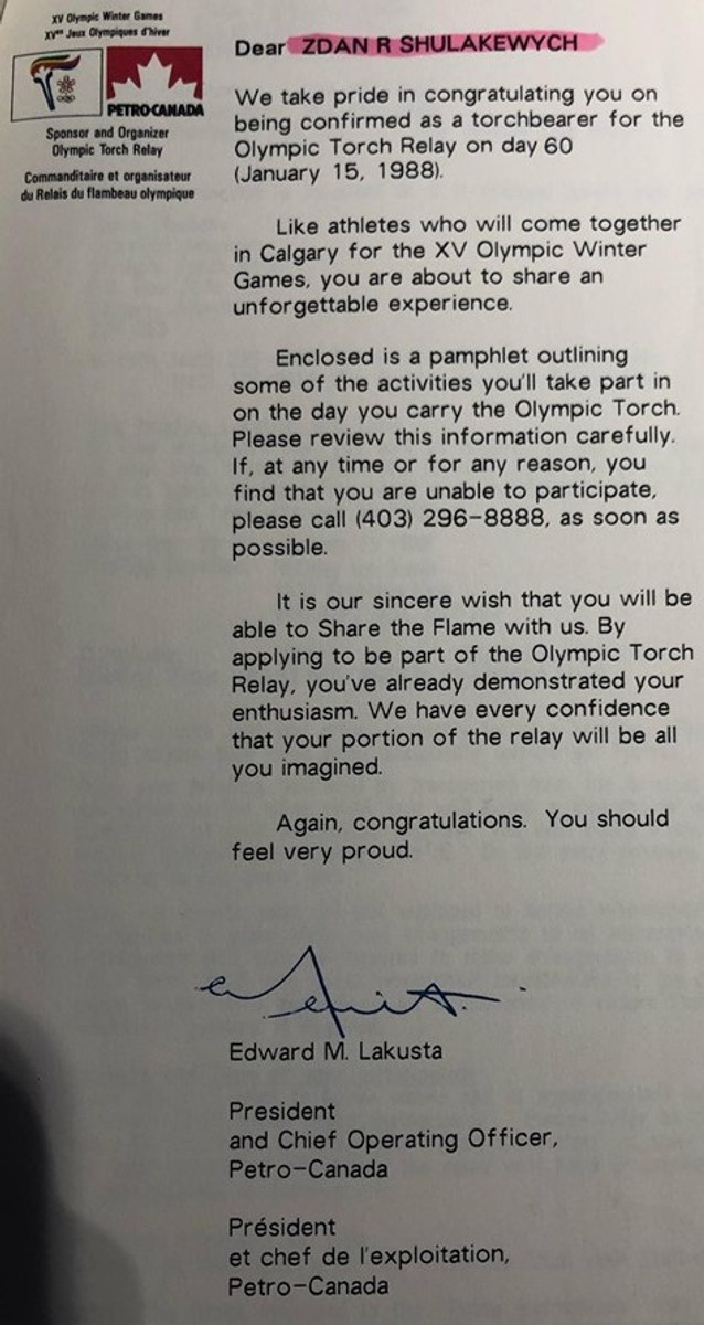 "Цього року відбулася в Калгарі XV Зимова Олімпіяда. Першою частиною цих змагань було перенесення олімпійського вогню з Греції до Калгарі. У вересні 1987 року вогонь перенесено з Атен на східне побережжя Канади. Сім мільйонів осіб зголосилося, щоб нести цей вогонь через цілу Канаду. Я зложив подання 400 разів, щоб могти бути учасником несення смолоскипа. Одного дня прийшов лист з повідомленням, що я буду нести смолоскип на одному кілометрі. Мене вибрали враз із 6200 іншими, які створили найдовшу олімпійську штафету в історії спорту.