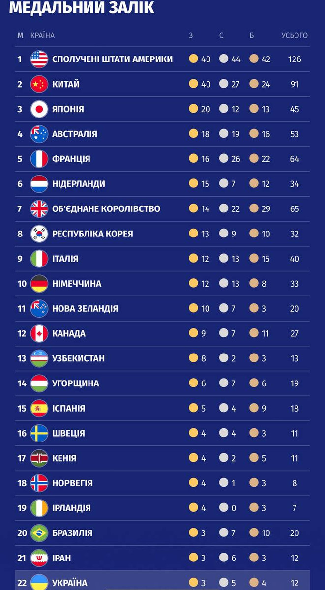 Підсумковий медальний залік Олімпіади-2024: США в останній момент вирвали перше місце, Україна — 22-га