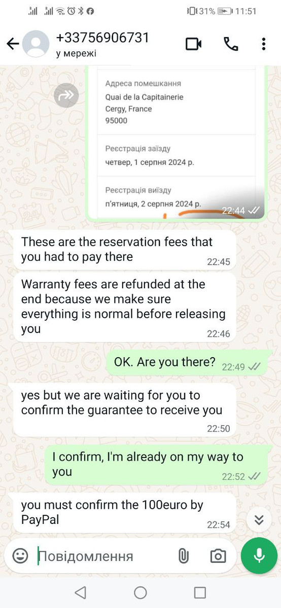 Сервіс зняв гроші, прислав квитанцію та підтвердження бронювання. Я взяв таксі й поїхав в помешкання. Паралельно почав набирати номер телефону власника апартаментів, який мені в підтвердженні бронювання надіслав сервіс. Телефон не відповідав. Я почав відправляти повідомлення на WhatsApp. Відповіді неприємно здивували. Спочатку "власник" написав, що їм ще не прийшло підтвердження від Booking.com. Потім, що сплачені гроші — це тільки комісія сервісу, потрібна доплата напряму. І запропонував переслати 100 євро на PayPall.