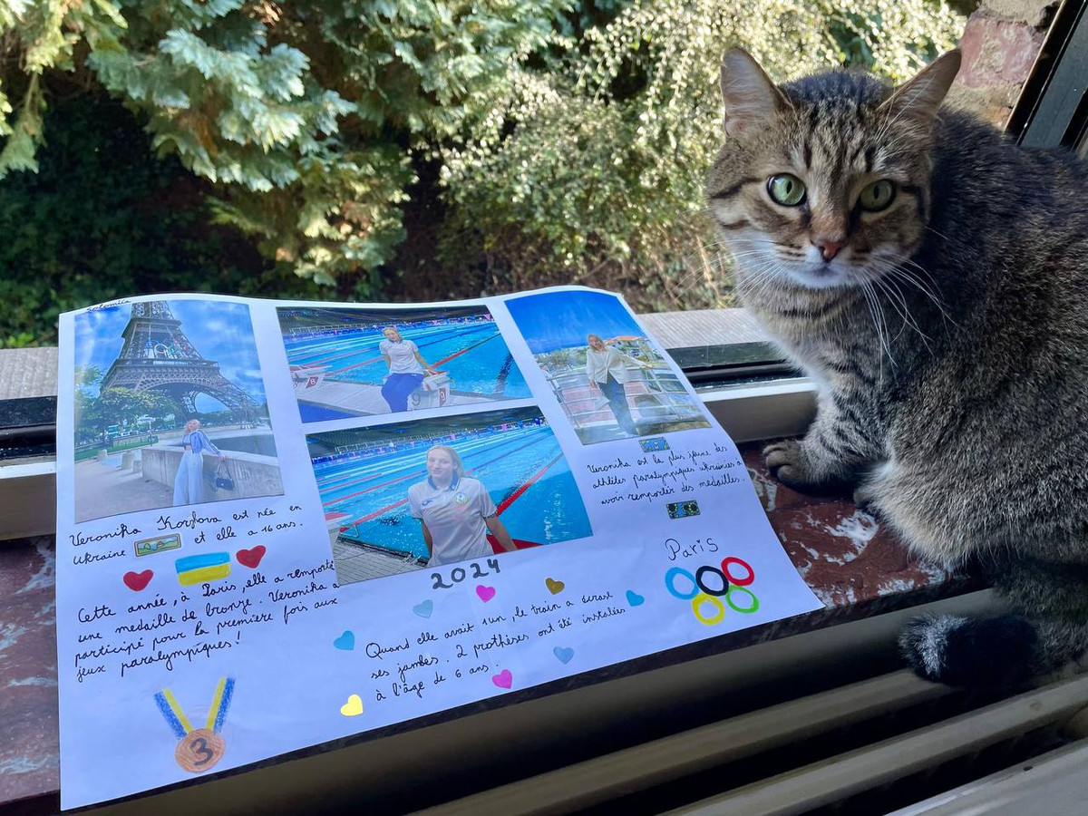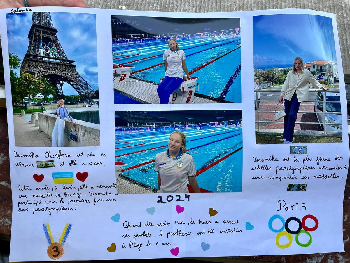 Проєкт 7-класниця готувала декілька днів. Роздрукувала фотографії, наклеїла світлини на папір і написала короткий текст. Каже, так і не змогла знайти фото, де Вероніка пливе в басейні.
