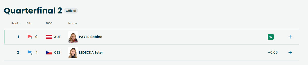 Фаворитка змагань поступилася австрійці Сабін Пауєр та залишиться без олімпійської медалі. Чинна чемпіонка програла суперниці 0,06 секунди. Розчарування результатом було настільки сильним, що чешка проігнорувала традиційне фото з опоненткою.