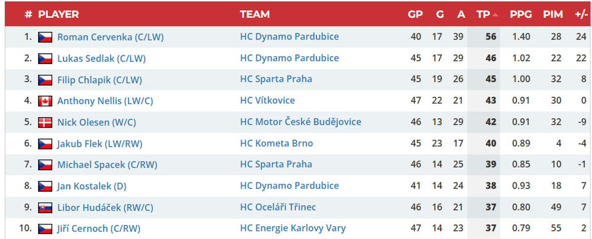 Ще одним лідером – ментальним так точно – буде 40-річний Роман Червенка. Його кар'єра в НХЛ досить скромна: лише 39 матчів за Калгарі в сезоні-2012/13. Решта частини кар'єри – Європа. Водночас не можна сказати, що він "пасажир" чи просто "талісман". Роман усе ще грає. І грає не так, як 722-річний Яромир Ягр на свята. Цього сезону форвард має 56 очок (19 + 37) у чеській Екстралізі, що дозволяє йому очолювати гонку бомбардирів.