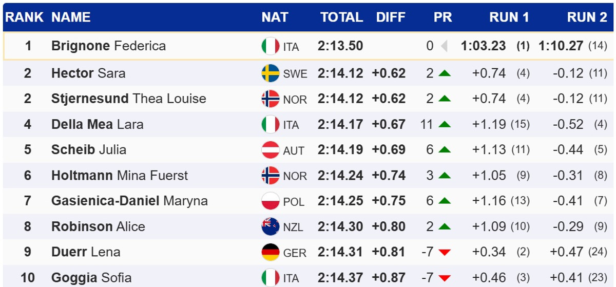 Бріньоне на 0,62 секунди випередила шведку Сару Хектор і норвежку Теа Луїзу Стьєрнесунд, які розділили друге місце.