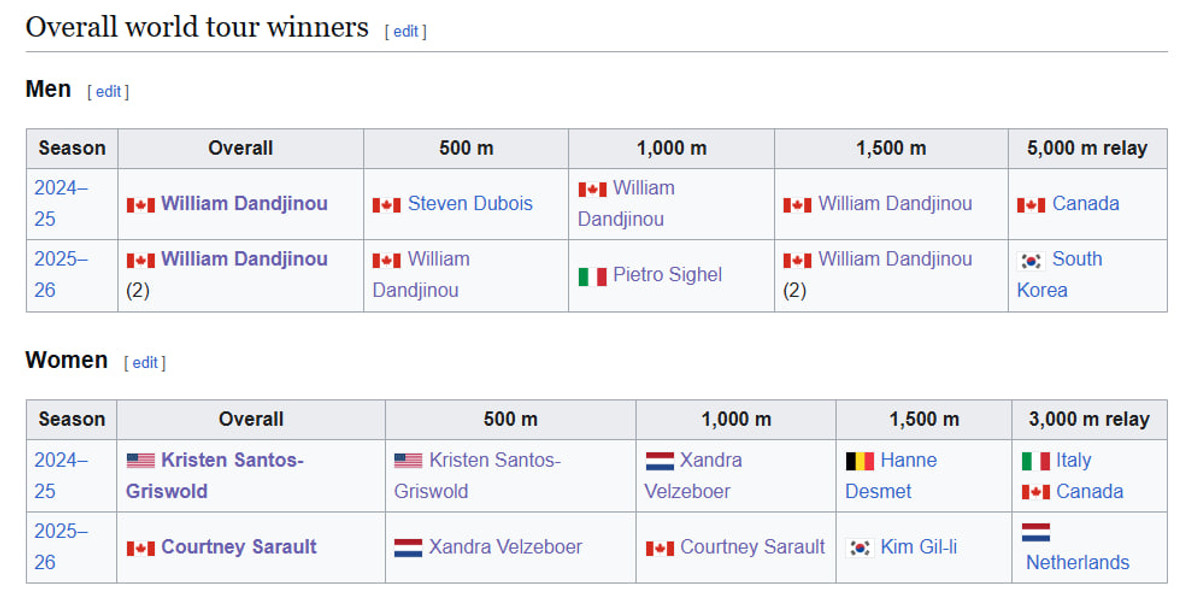 Варто зазначити, що Світовий тур у нинішньому форматі було засновано лише у 2024 році. Раніше, з 1998 року, проводився ISU Short Track Speed Skating World Cup. Домінували Південна Корея, Канада та Китай.