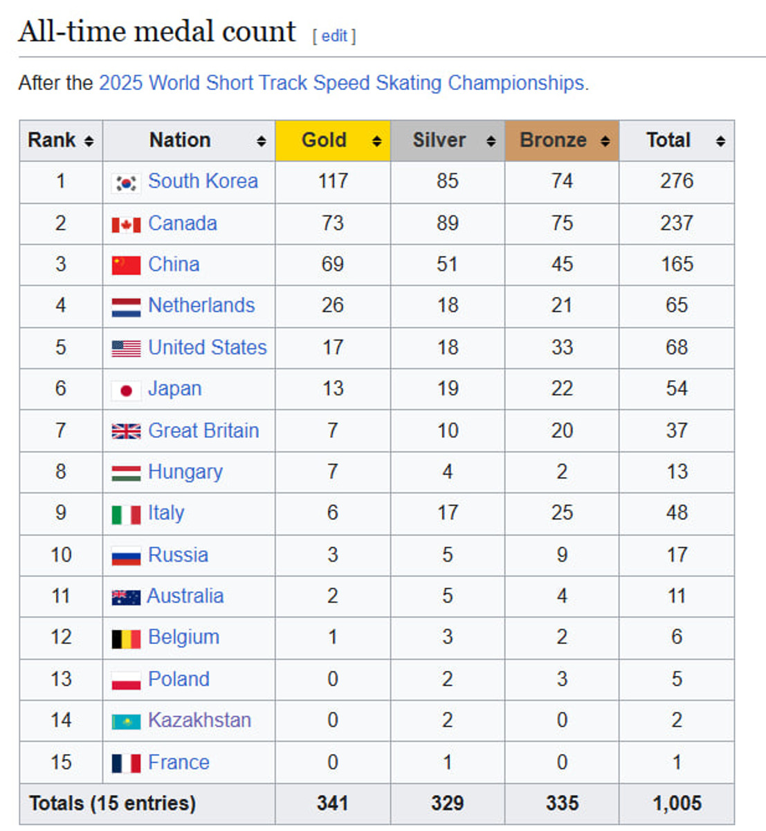 Чемпіонат світу з шорт-треку стартував ще у 1976 році. За всю історію медалі здобували лише 15 країн, а беззаперечним лідером залишається Південна Корея.