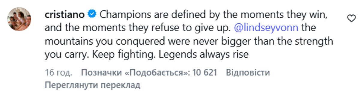 Ліндсі, твоя сила вища за гори, які ти підкорила. Продовжуй боротися. Легенди завжди відроджуються", – написав Роналду.