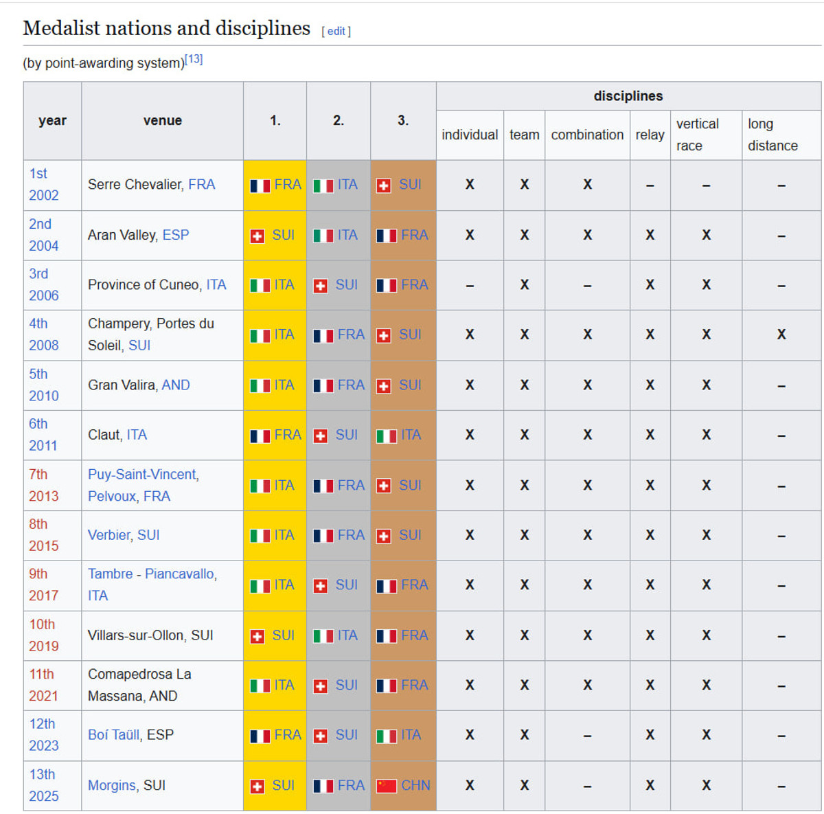 Світові першості приймали Італія, Франція, Швейцарія, а іноді господарями виступали гірські висоти Іспанії та Андорри.