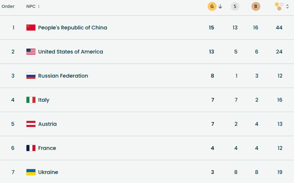 Китайці виграли медальний залік і цього разу. Вони завоювали 44 медалі: 15 золотих, 13 срібних та 16 бронзових. Другими завершили змагання американці. На їхньому рахунку 24 нагороди (13-5-6). Третіми стали представники країни-агресорки з 12 медалями (8-1-3).