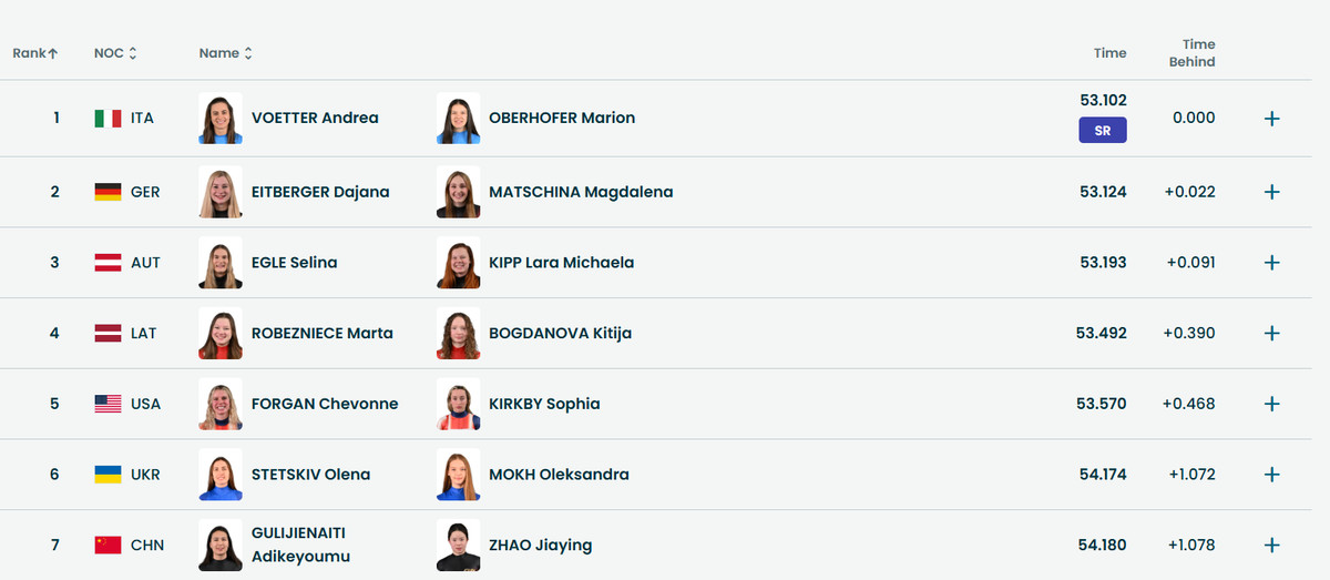 У першому спробі брали участь 11 пар. З результатом 53.102 лідирують італійки Андреа Феттер і Маріон Обергофер.