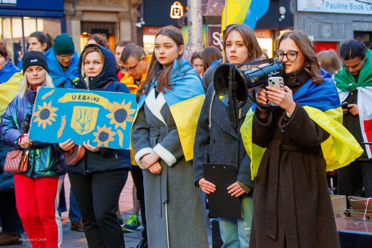 Мітинг в найбільшому місті Шотландії, який організувала Асоціація українців у Великій Британії (AUGB) Глазго (Glasgow), був присвячений 4-й річниці початку повномасштабної російської агресії в Україні.