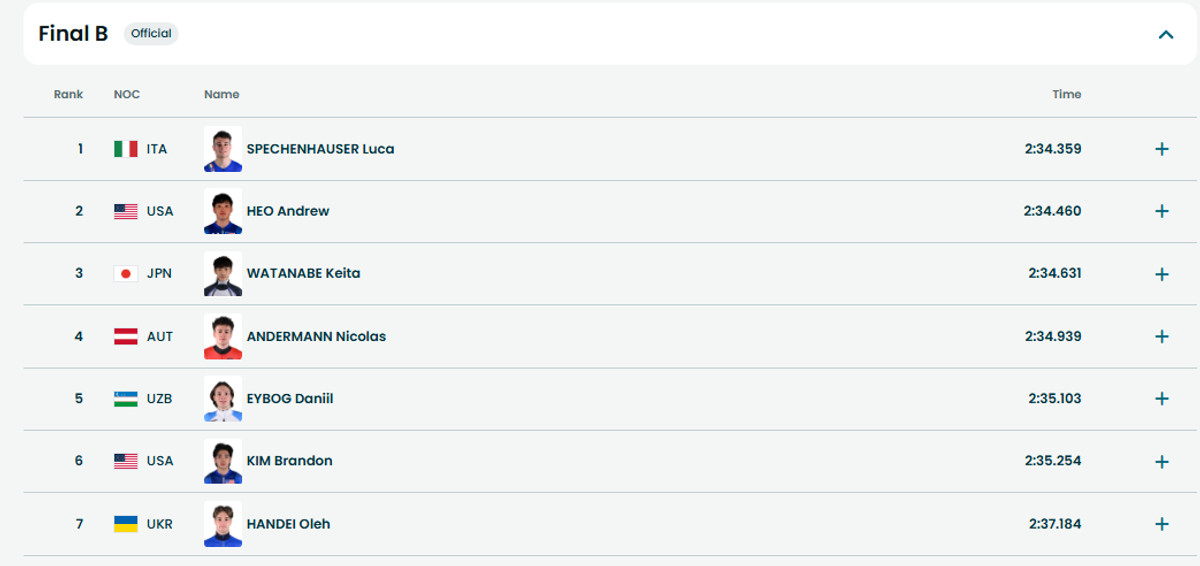 Україну в цій дисципліні представляв Олег Гандей. Наш спортсмен кваліфікувався до втішного Фіналу В, де показав сьомий результат із часом 2:37.184.