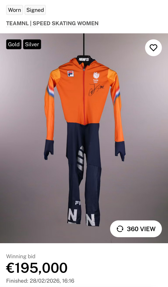 Саме в цьому помаранчевому комбінезоні Лердам тріумфувала на дистанції 1000 метрів, встановивши олімпійський рекорд і розплакавшись після фінішу. Продаж організувала платформа MatchWornShirt, і ціна злетіла з 3000 до майже 200 тисяч євро за лічені години.