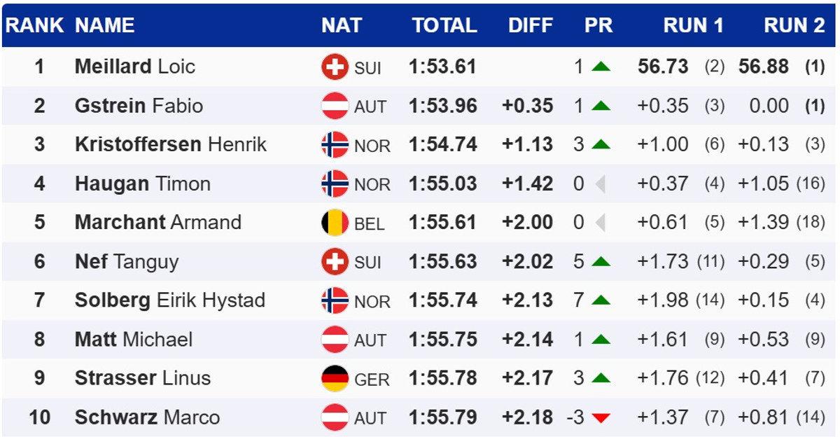 Він на 0,35 секунди випередив австрійця Фабіо Гштрайна. Бронзу завоював легендарний норвежець Хенрік Крістофферсен. Його партнер по команді, Атле Лі Макграт, лідирував після першої спроби, проте зійшов із дистанції в другому заїзді.