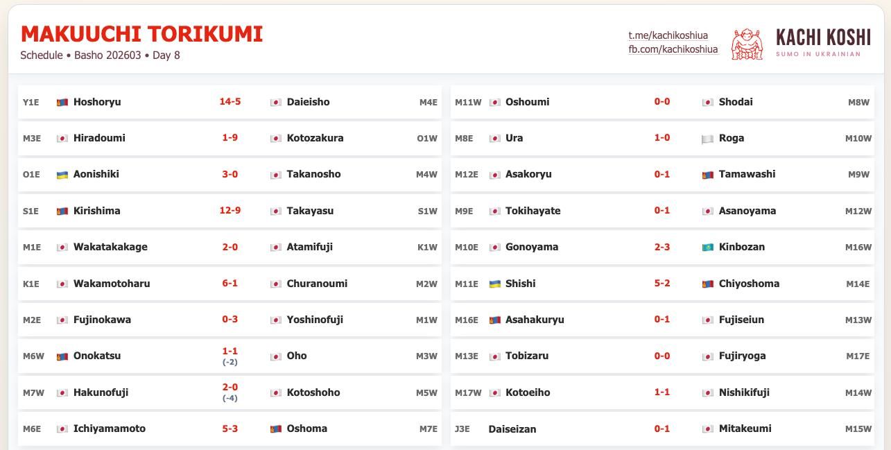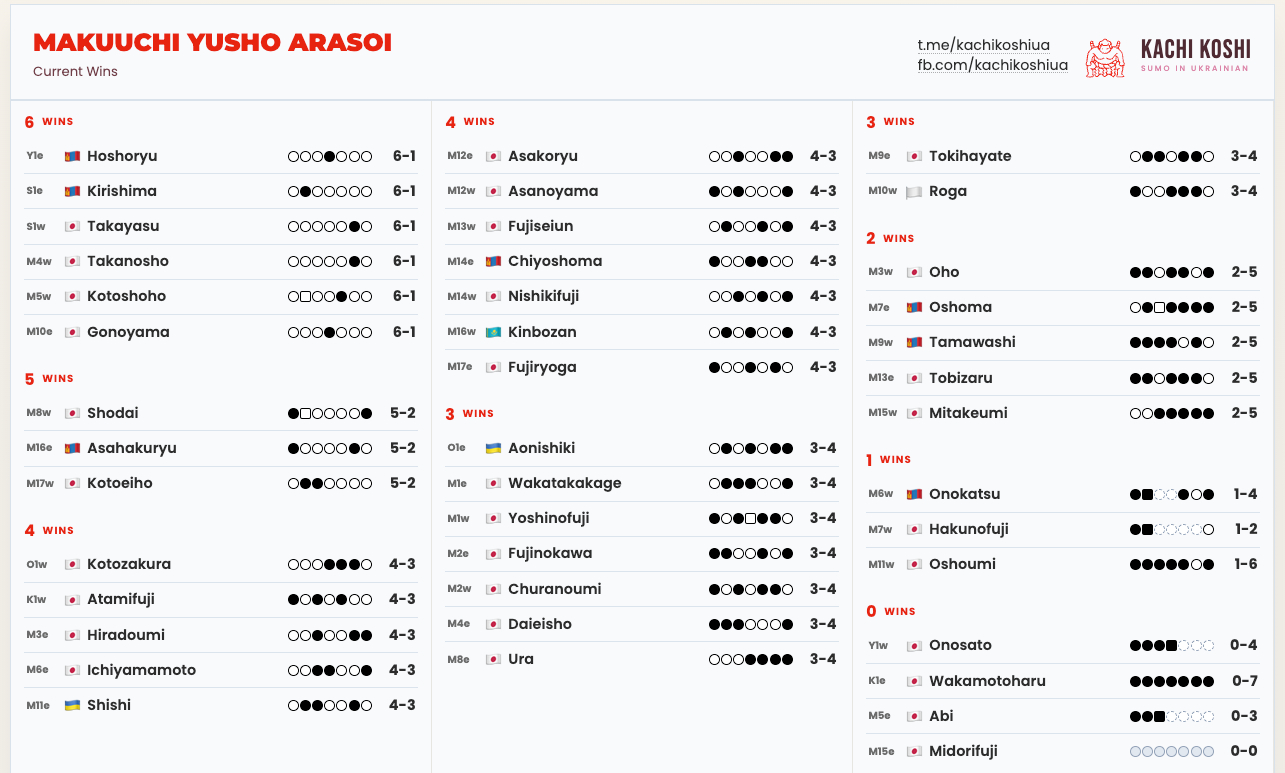Шість рікіші з результатом 6-1 ділять лідерство. Одним із них є Таканошо, з яким Данило буде боротися завтра.