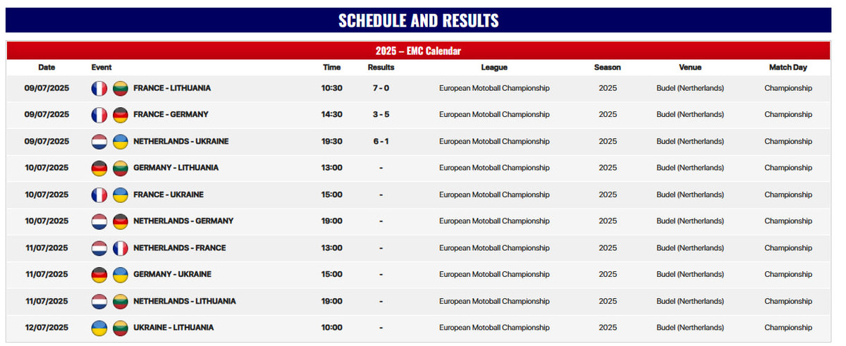 Відкрила чемпіонат Європи зустріч між Францією та Литвою. Французькі мотоболісти не мали проблем із суперником, забивши 7 голів. Литовці голів не забивали.