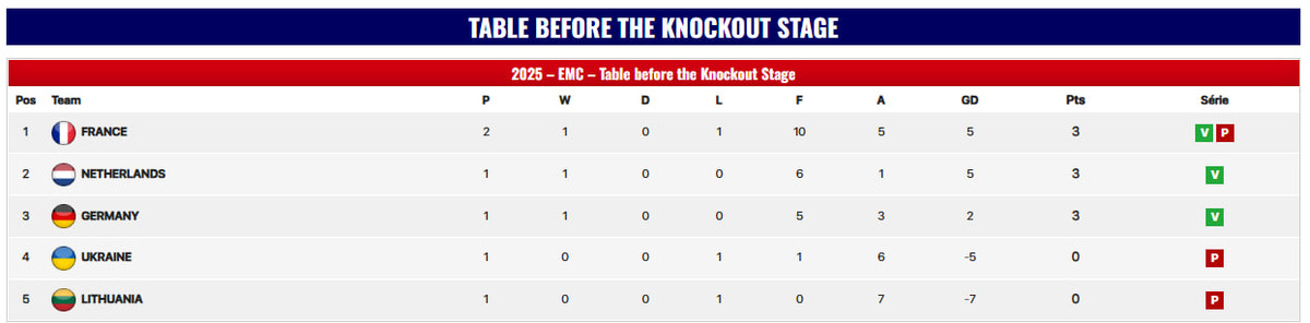 Після першого ігрового дня Нідерланди, Франція та Німеччина мають по 3 очки. Україна наразі посідає четверту сходинку, яка дає право виходу до півфіналу.