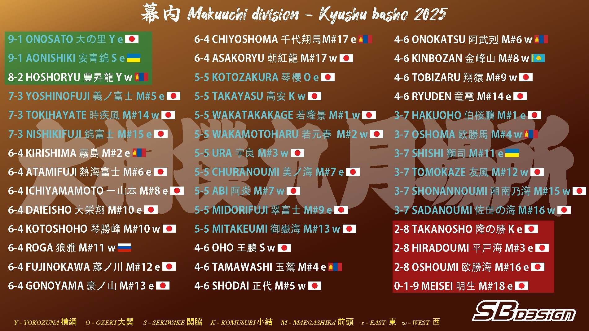 Турнірна таблиця турніру Kyushu 2025 після 10 днів змагань