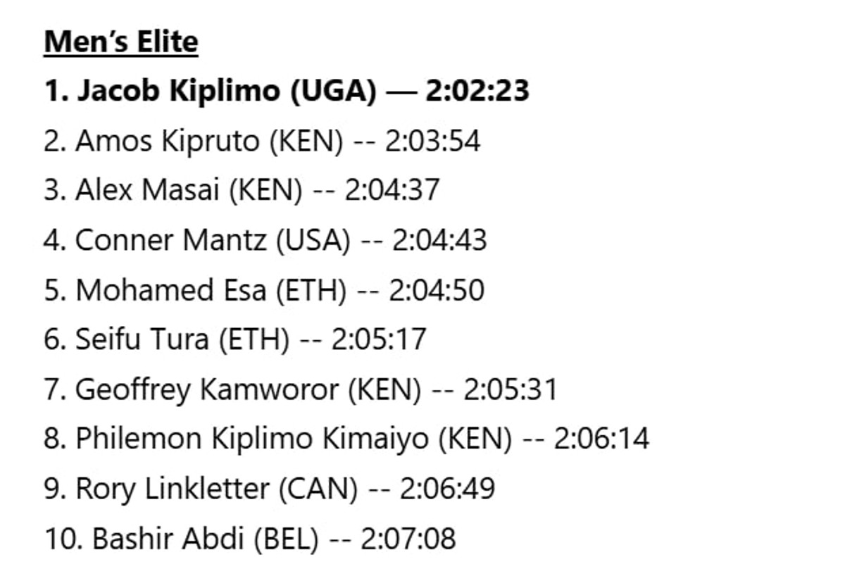 Кіплімо майже на дві хвилини відстав від рекорду траси та світу, встановленого переможцем попереднього року, кенійцем Кельвіном Кіптумом, який загинув у дорожньо-транспортній пригоді минулого року.