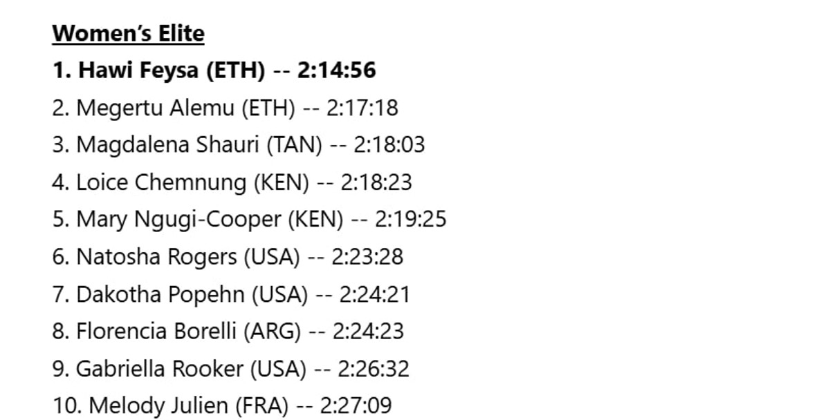 Фейса показала час 2:14:56. Вона перемогла свою співвітчизницю Мегерту Алему з перевагою 2 хвилини і 22 секунди.