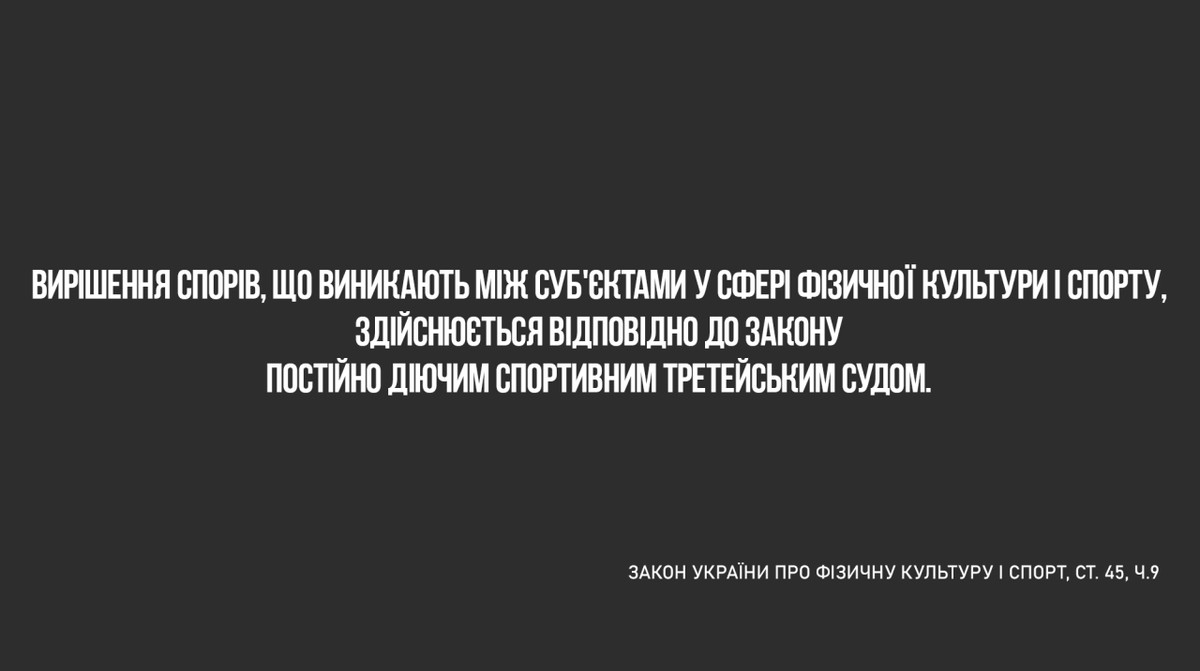 Виникає логічне запитання, чому САС не працює? Адже навіть сам закон про фізичну культуру і спорт передбачає, що всі суперечки мають вирішуватися у спортивному третейському суді.