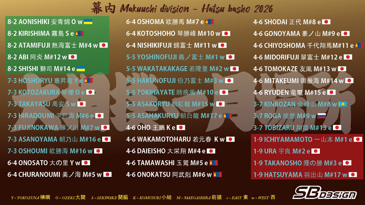 Аонішікі зійдеться на дохйо з Хакунофуджі (5-5). Кірішіма буде боротися з Оносато. Японець може зазнати четвертої поразки поспіль. Утім, враховучи, що монгол зараз є прямим конкурентом для українців, треба вболівати за йокозуну.