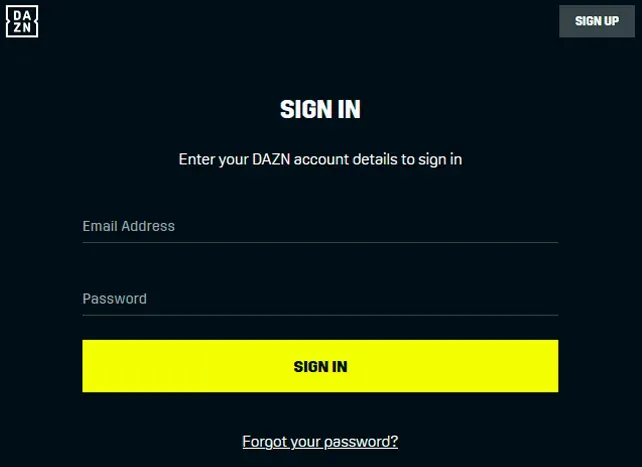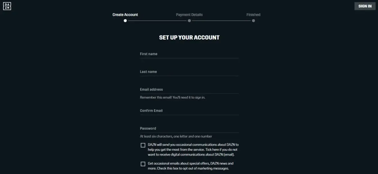 Зайдіть на сайт DAZN та пройдіть просту процедуру реєстрації. Треба буде вказати свою електронну пошту та придумати пароль (або увійдіть за допомогою свого облікового запису, якщо ви вже зареєстровані на платформі).