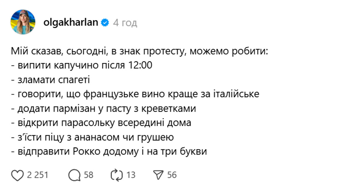 "Мій сказав, сьогодні, в знак протесту, можемо робити: