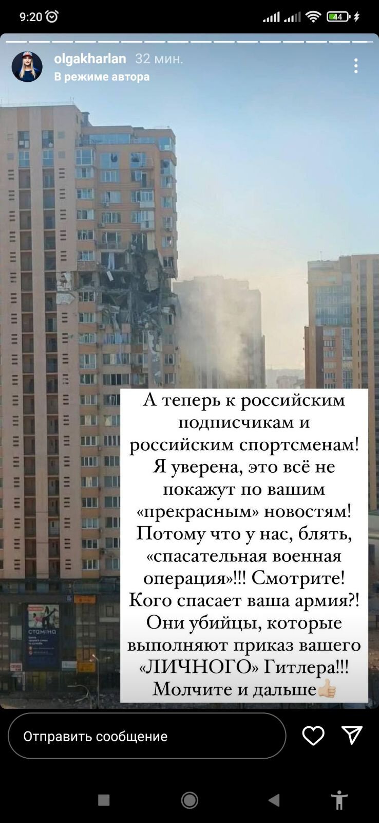 "А тепер до російських підписників та російських спортсменів. Я впевнена, це все не покажуть вашими "прекрасними" новинами. Тому що у нас, б###ь, "рятувальна військова операція". Дивіться! Кого рятує ваша армія? Вони вбивці, які виконують наказ вашого "особистого" Гітлера! Мовчіть далі", – написала Харлан.