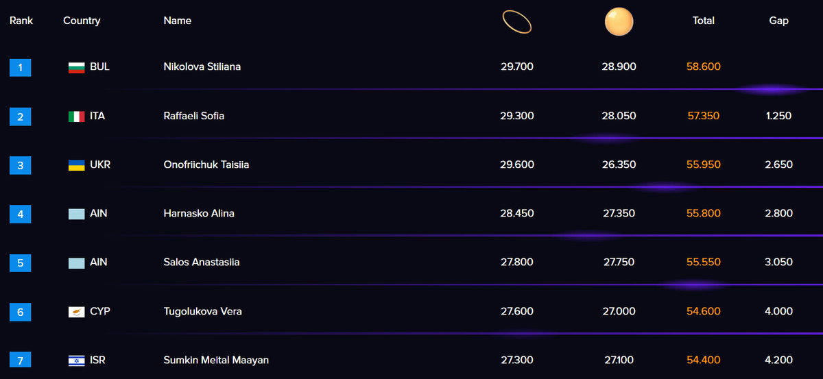 Вправи з обручем краще вийшли в обох українок: Таїсія посіла друге місце кваліфікації з результатом 29,600 бала, а Поліна за свій виступи отримала 26,950 бала та підсумкове десяте місце.