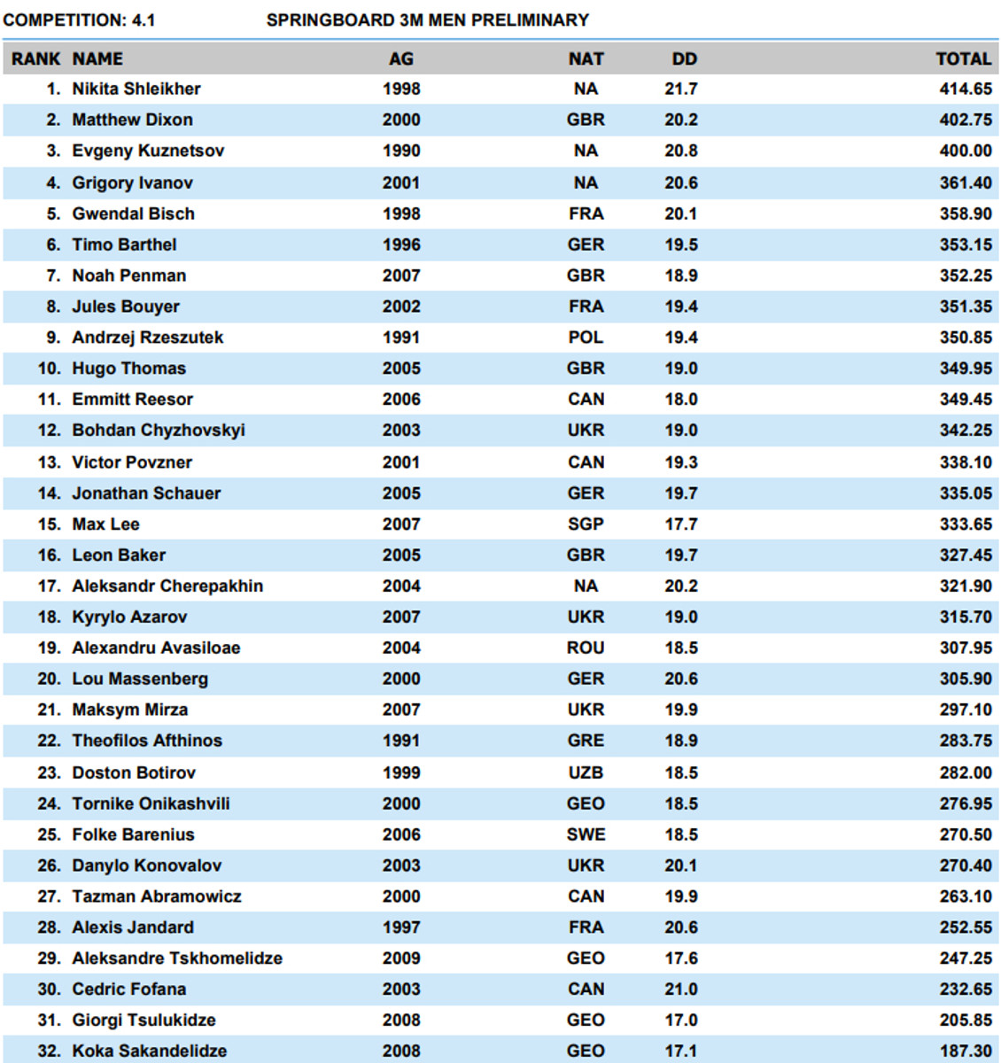 - 1. Нікіта Шлейхер (нейтральний атлет) – 414,65 бали