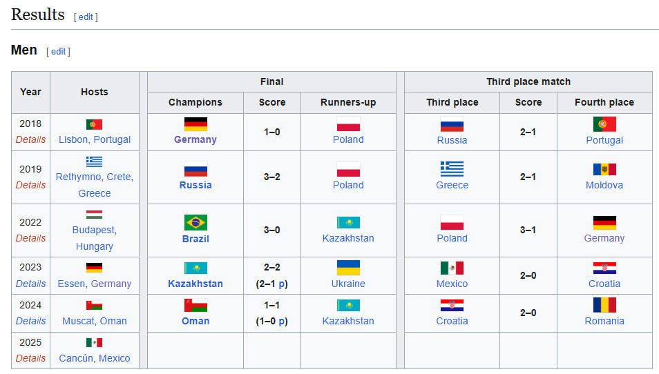 Лідирує Казахстан, який вигравав титул у 2023 році. Чинним чемпіоном світу є збірна Оману.