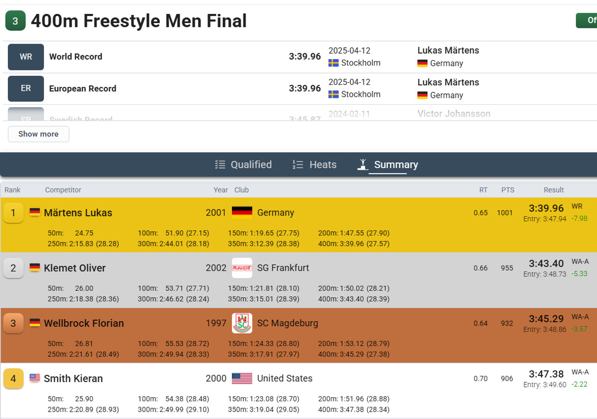 Ця історична подія сталася під час Malmsten Swim Open Stockholm 2025. У фіналі змагань 23-річний спортсмен проплив дистанцію за 3:39,96, що стало новим європейським та світовим рекордами.