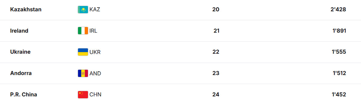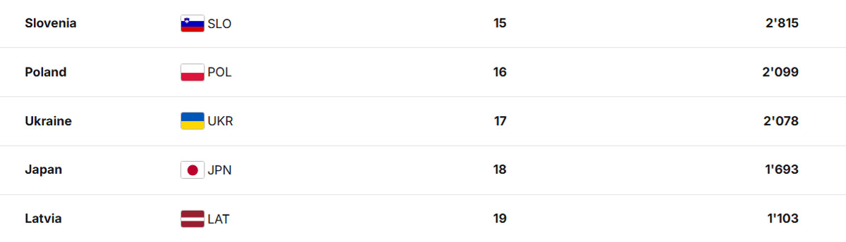 Україна опинилася 17-ю та 22-ю в жіночому та чоловічому рейтингах відповідно. В результаті цього на ОІ-2026 від України у лижних перегонах виступлять п'ять спортсменів (три у жінок та два у чоловіків).