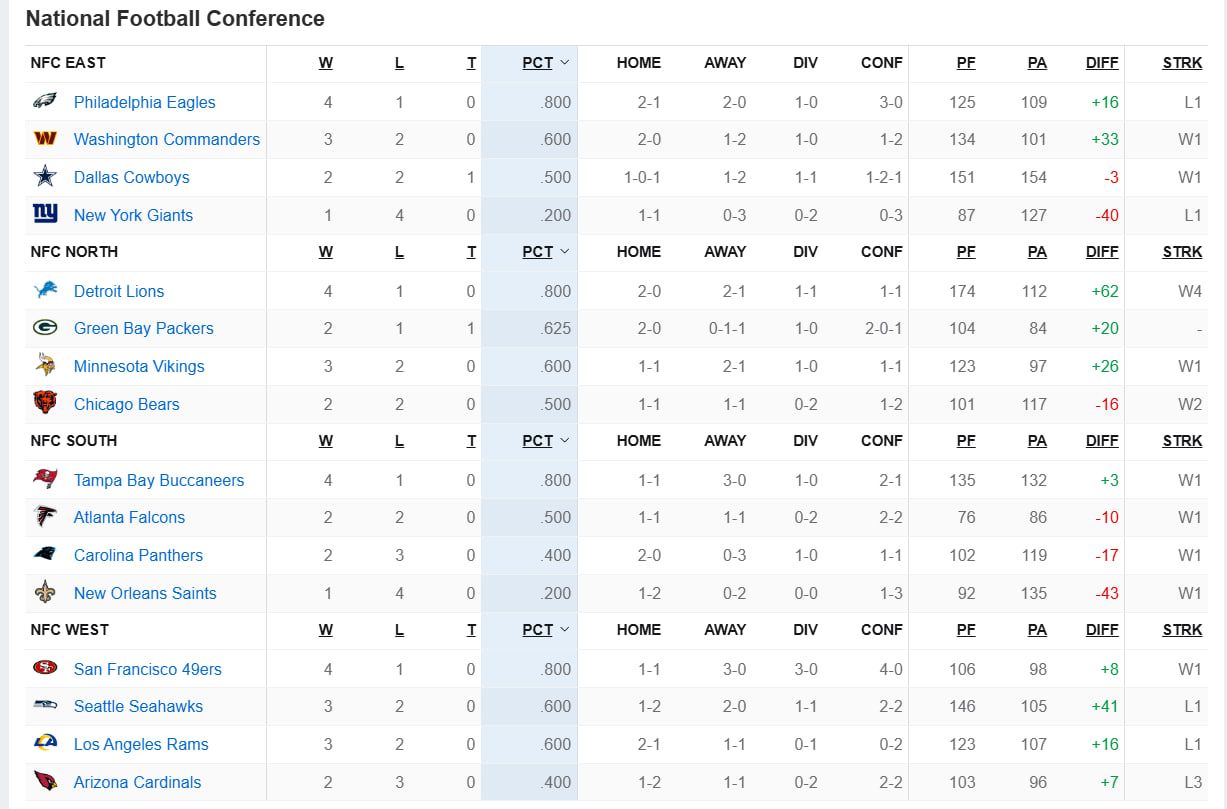 Бейкер Мейфілд веде Бакканірз високо – 4-1 у результаті 1283 ярди, 10 тачдаунів і лише 1 втрата. У 49ers велика кількість травм, але Брок Перді та Крістіан Маккефрі ще тримають команду серед фаворитів.