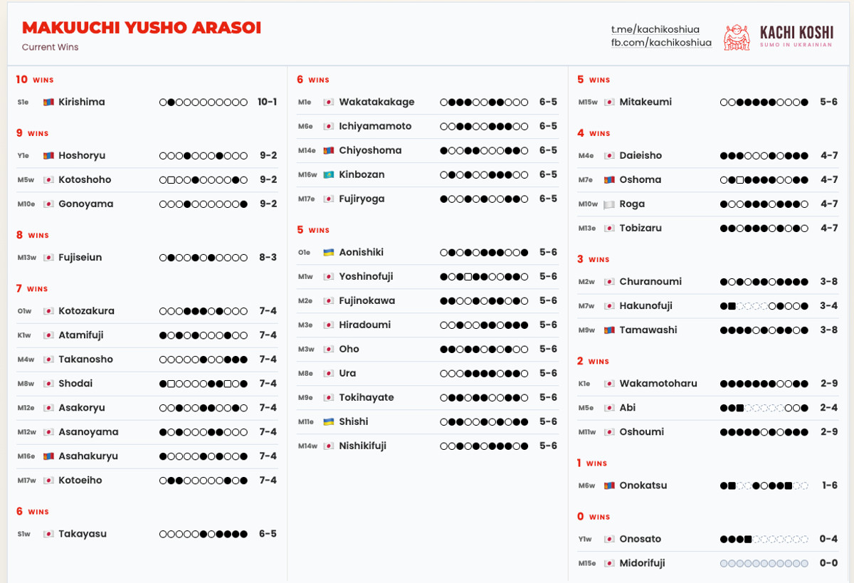 Переміг і йокозуна Хошорю. Завдяки успіху він залижається в пулі претендентів на юшо (перемогу). Йокозуна Оносато через травму знявся з турніру.