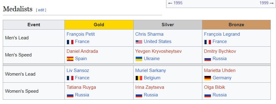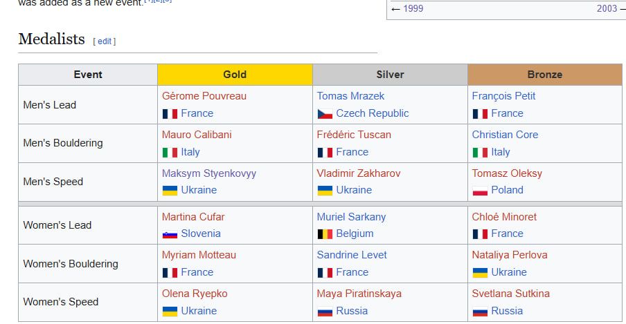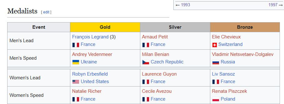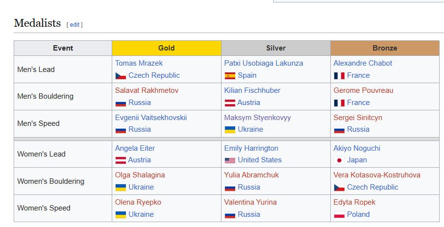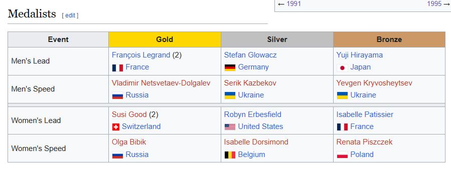На першому світовому чемпіонаті українців ще не було. Але вже за два роки, у 1993-му, в австрійському Інсбруку вони гучно заявили про себе. У швидкісному скелелазінні "срібло" здобув Серік Казбеков. До речі, його донька – Євгенія Казбекова, про яку вже згадували раніше, – згодом також прославилася в цьому виді спорту.
