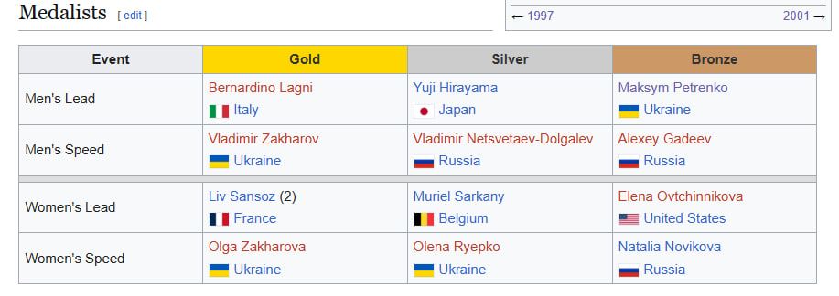 Українки вперше дебютували у швидкісному скелелазінні ще 1993 року, але довго не могли пробитися до медалей. Справжнім проривом став 1999 рік: Олена Захарова стала чемпіонкою світу, а Олена Ріпко – здобула "срібло".