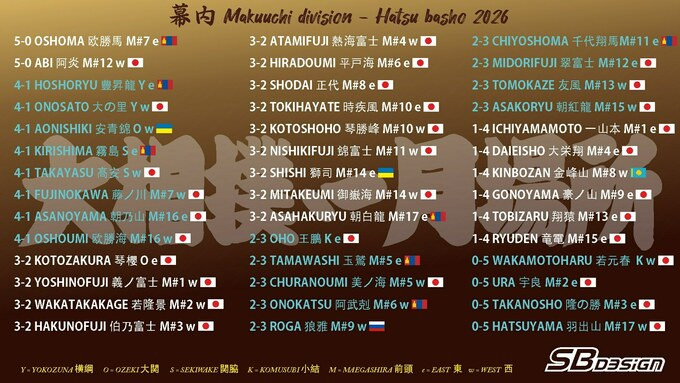 Турнірна таблиця Hatsu Basho 2026 після 5 днів
