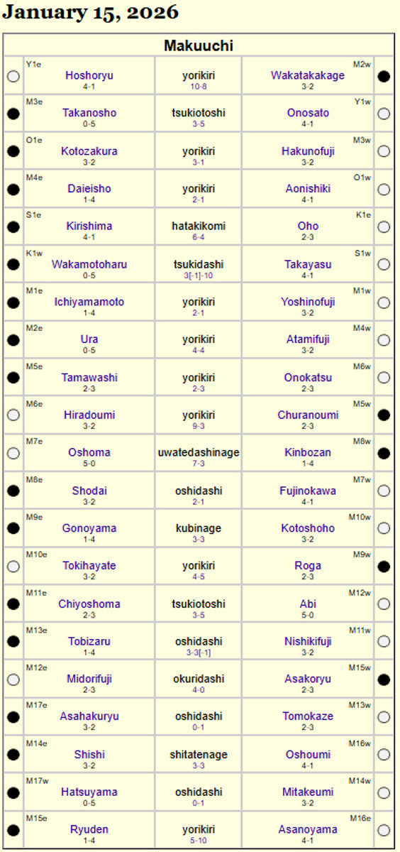 Також сьогодні перемоги здобули йокозуни Оносато (4-1) та Хошорю (4-1). Без поразко тримаються борці Ошома та Абі.