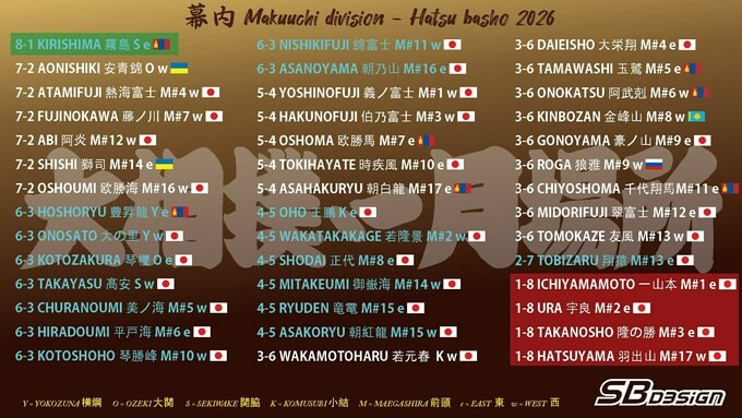 Hatsu Basho триватиме до 25 січня. Протягом 15 днів усі борці проведуть по 15 сутичок. Якщо у лідерів буде однаковий показник (12-3, 13-2,), то між ними проводитимуться додаткові матчі плейоф.
