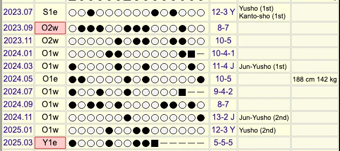 - Санданме (Sandanme) – Hananofuji East Sandanme #23, стайня Isegahama – 7-0