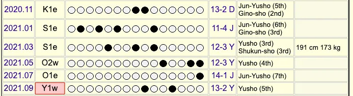Також Терунофуджі свого часу вигравав два турніри поспіль після підвищення, проте він уже мав досвід виступів у статусі озекі й фактично повертався після важкої травми.
