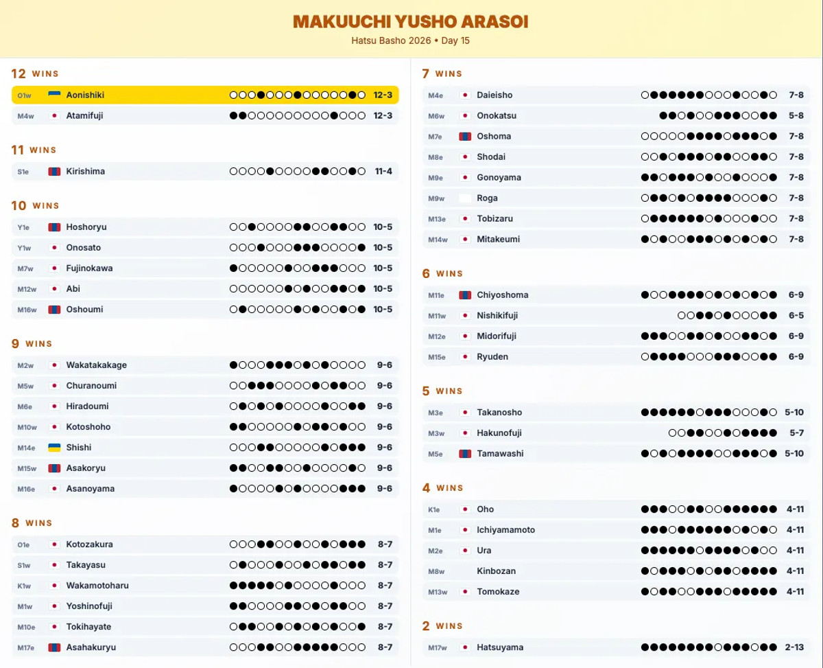 Січневий Hatsu basho 2026 у Токіо проходив з 11 по 25 січня та завершився черговим тріумфом українця – озекі Аонішікі Арата (Данила Явгусишина), який виграв другий імператорський турнір поспіль.