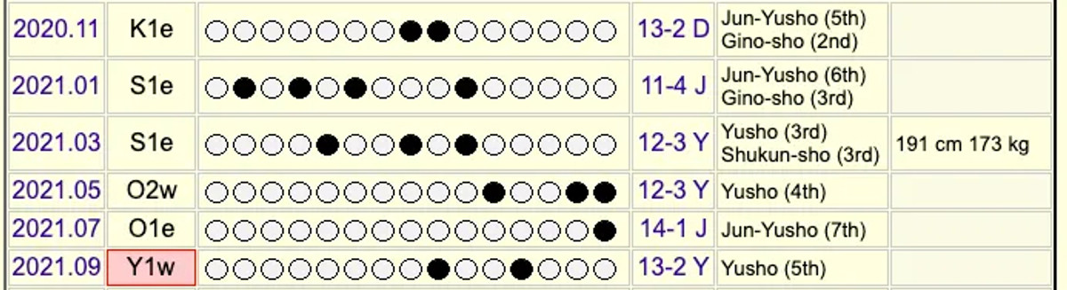 Також Терунофуджі свого часу вигравав два турніри поспіль після підвищення, проте він уже мав досвід виступів у статусі озекі й фактично повертався після важкої травми.