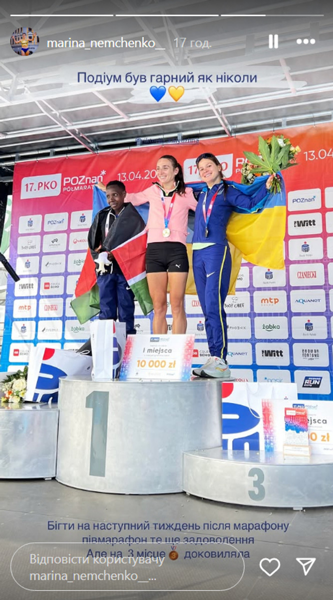 "Подіум був гарний як ніколи. Бігти на наступний тиждень після марафону півмарафон – те ще задоволення. Але на 3 місце доковиляла", – так Немченко прокоментувала в Instagram свій виступ.
