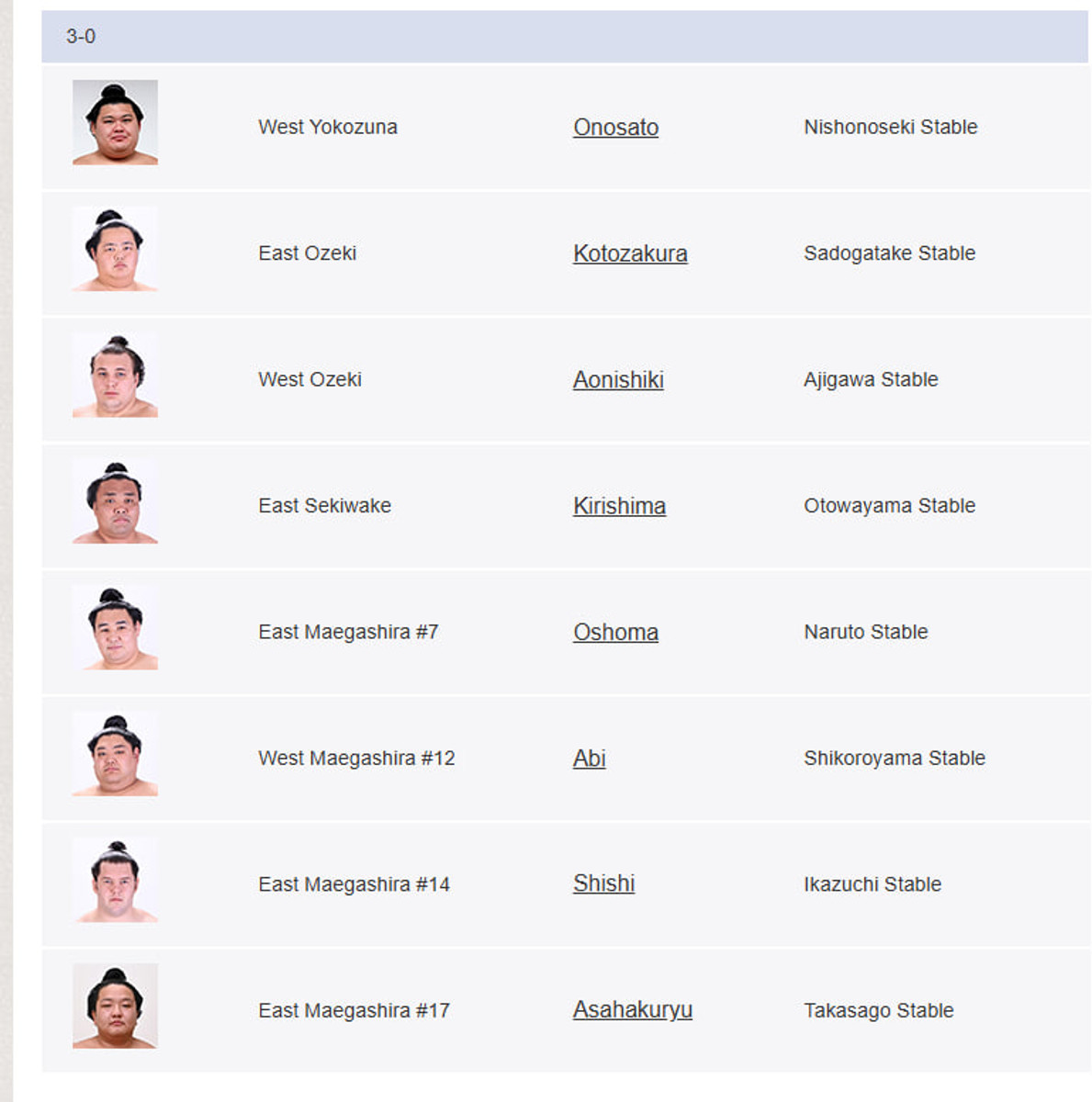 Йокозуна Оносато (3-0) здолав сумоїста Ура (0-3). Ура на турнірі також вже боровся з Аонішікі, якому програв у перший день Hatsu Basho.