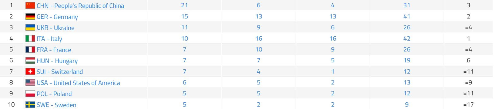 Лідирувати продовжує Китай, другою йде Німеччина, водночас Україна обійшла Італію.